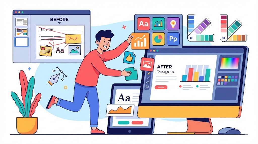 Layanan Make Over Slide untuk mempercantik presentasi tanpa mengubah materi, ditata profesional agar lebih jelas, menarik, dan pesan tersampaikan efektif.